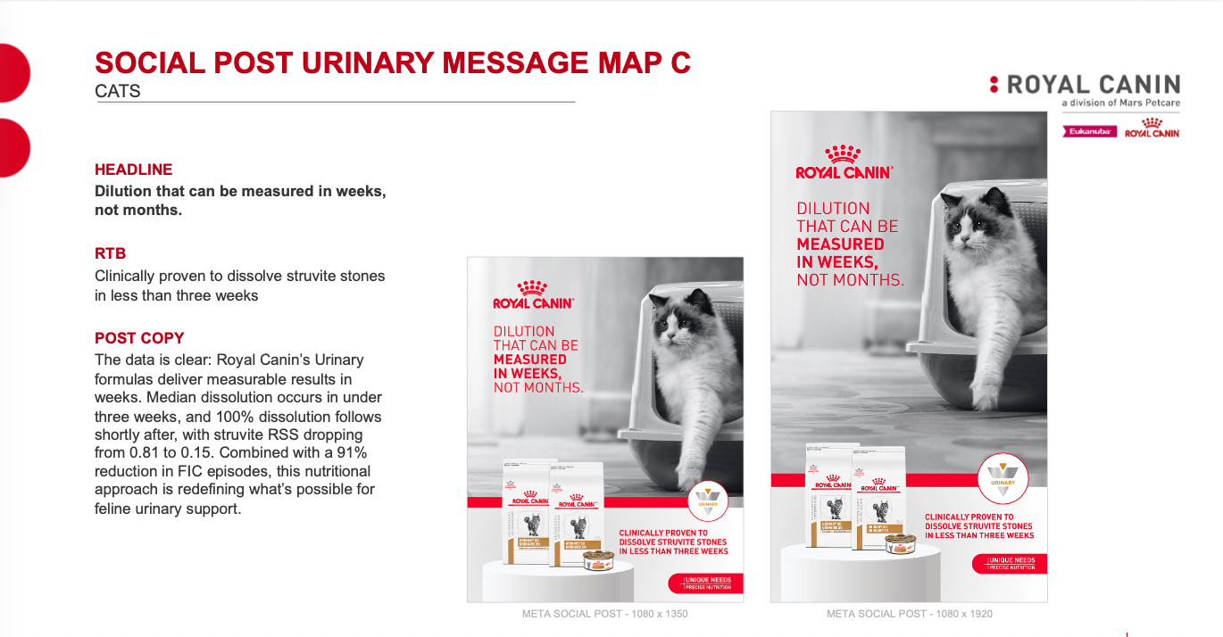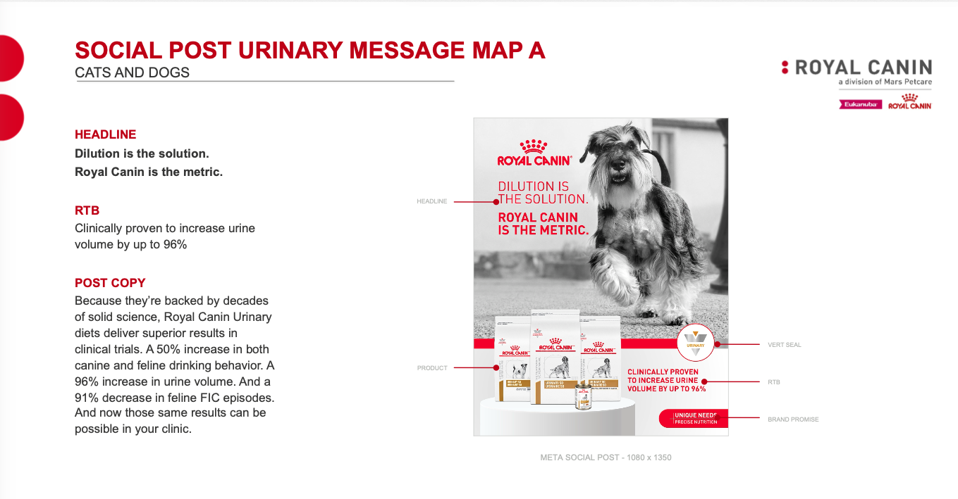 Beginning with a simple retooling of Royal Canin’s current message, “Dilution is the solution”, here are three of our strongest options, based on the three strongest claims.